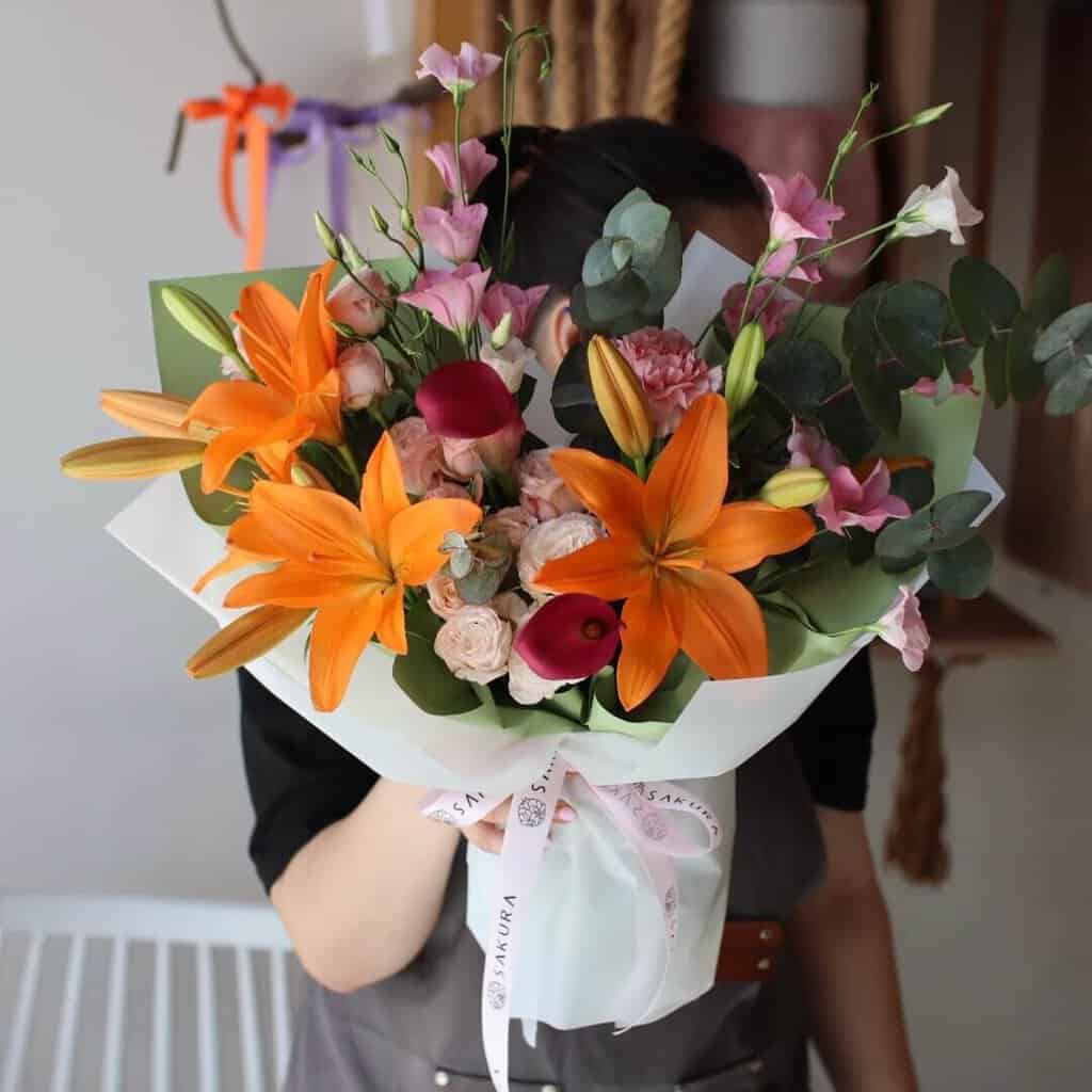 Brighten someone’s day with our stunning Sunset Harmony Bouquet. Featuring radiant orange lilies, delicate pink lisianthus, blush roses, and bold red calla lilies, all beautifully arranged with lush eucalyptus. Perfect for any occasion!